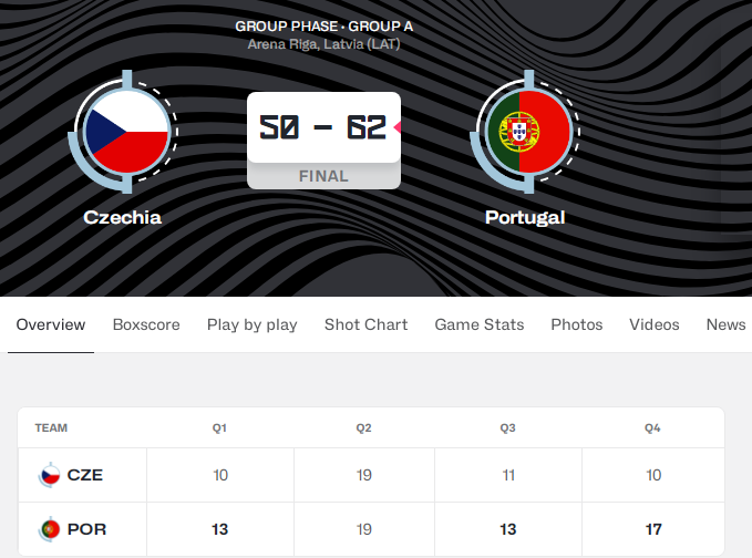 葡萄牙男篮首节13-10领先捷克男篮,次节双方单节维持19-19,从而上半场结束葡萄牙男篮取得32-29领先优势。下半场比赛,葡萄牙男篮第三节13-11净胜2分,第四节17-10净胜7分,最终葡萄牙男篮62-50战胜捷克男篮。